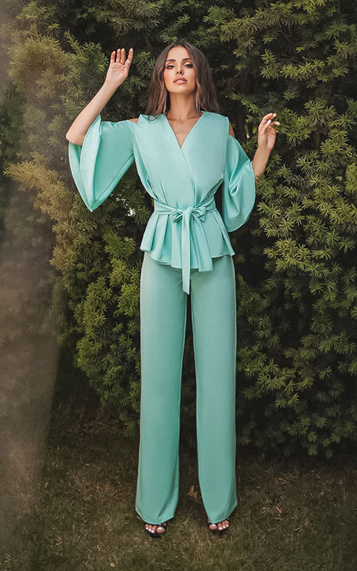 Верх костюма с оригинальным вырезом на плече, регулируется поясом, на запах